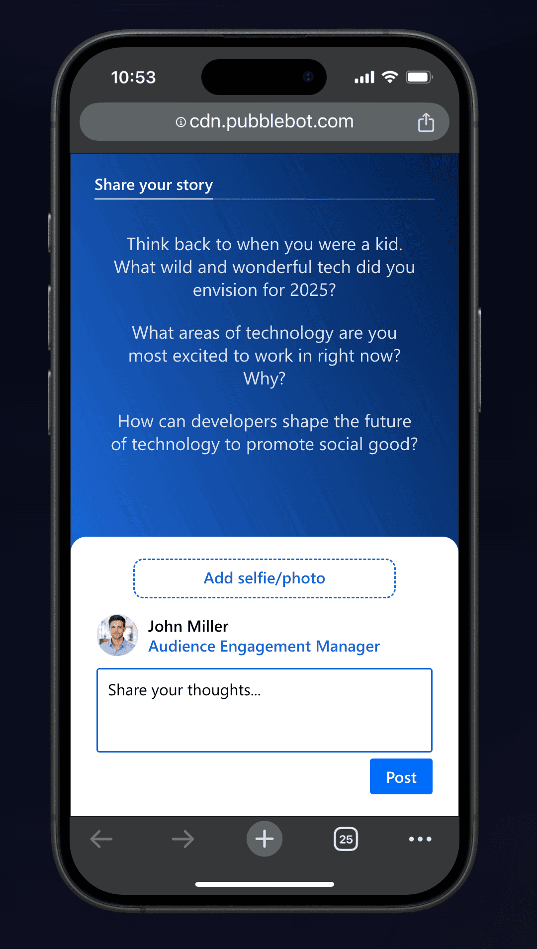 Pubble Selfie lets attendees share a moment from the event and see it live, turning faces in the crowd into energy on the screen.
